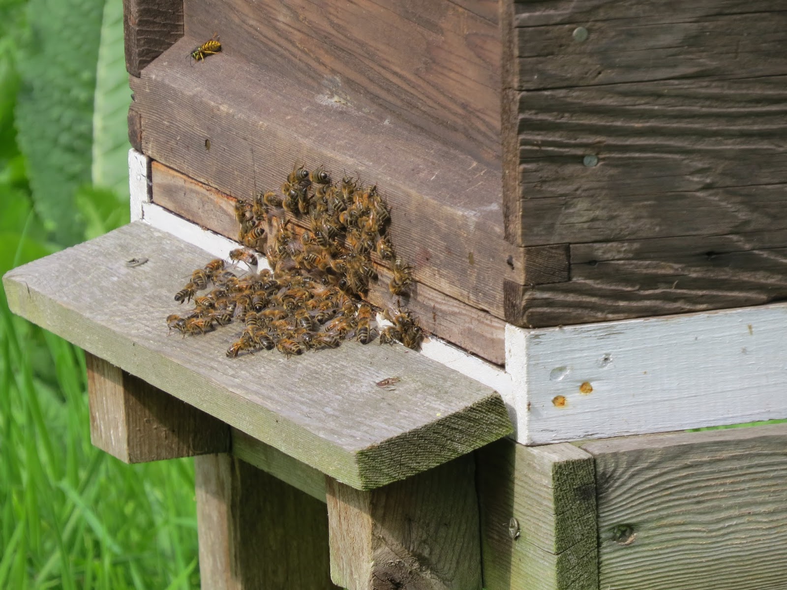 I now have just two bee hives. They survived the wasps last year (last year was a very bad year for wasps and hornets). Here is one wasp trying its luck and hoping to sneak into the hive to attack the bees and steal the honey...